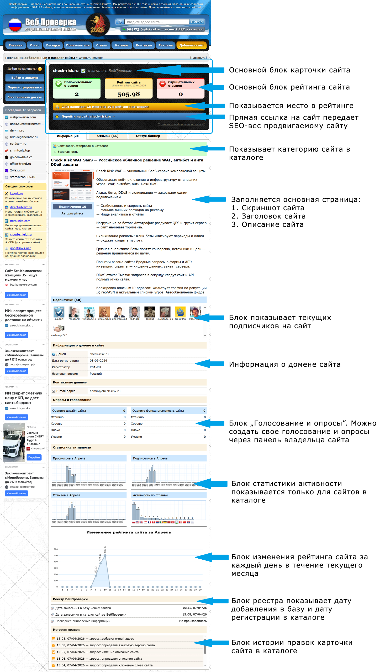 Первым делом редактор каталога заполняет информационную карточку сайта. Давайте разберем каждый блок информационной карточки. Ее также можно редактировать самостоятельно. Для этого необходимо подтвердить права на сайт. После этого вам будет доступна панель редактирования карточки, которая показывается в верхней части информационной карточки.
