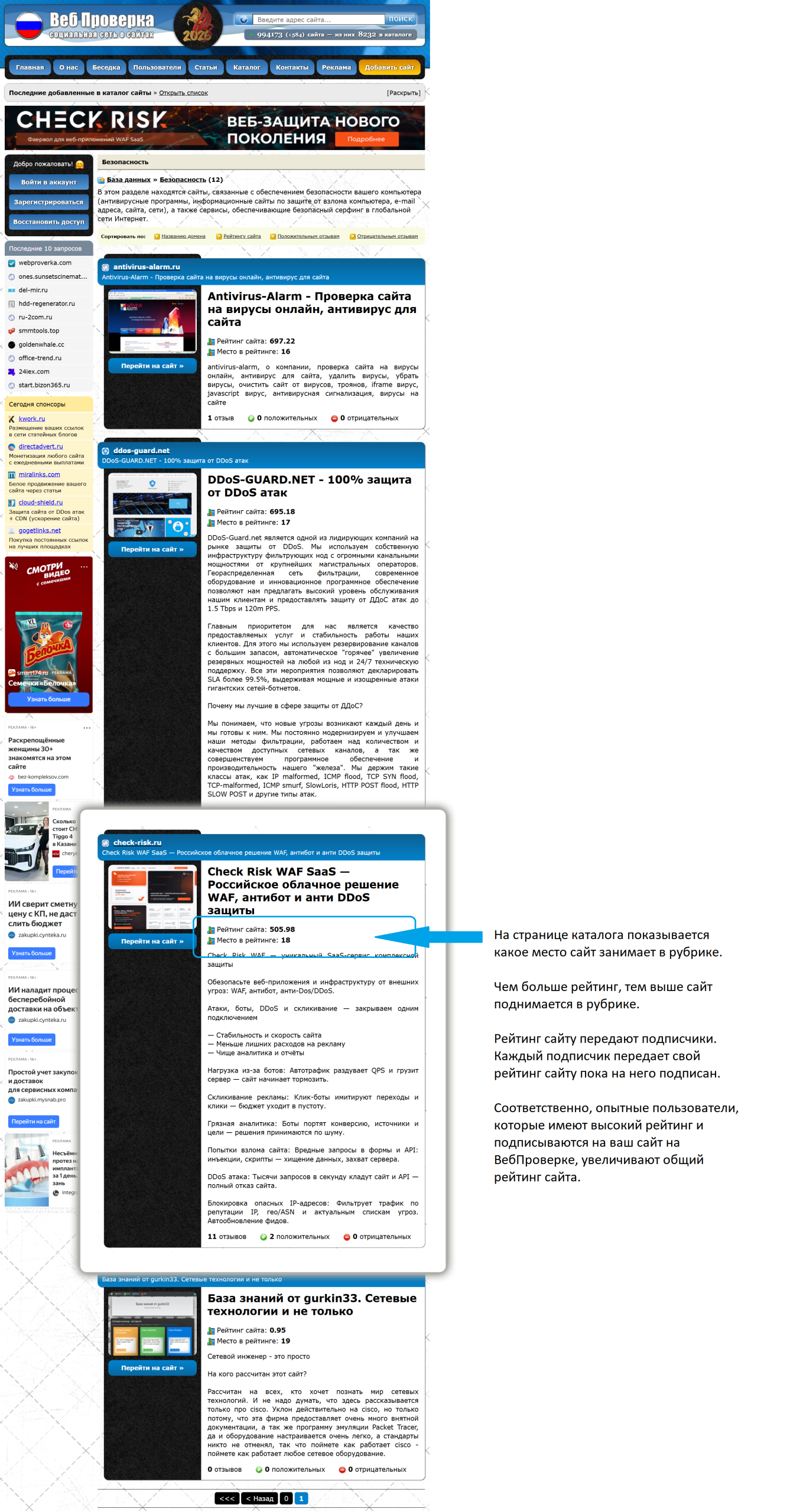 А так отображается информация о сайте в выбранной рубрике. Каждый сайт имеет имеет свое место в рубрике. Список сайтов сортируется по рейтингу. Чем больше рейтинг, тем выше сайт размещается в рубрике каталога.